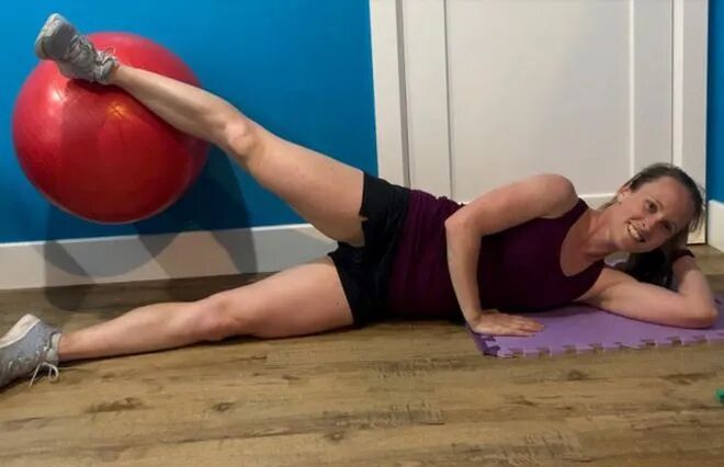先以左侧身体侧躺,背靠一面墙,右腿与墙之间放一个健身球。用右腿将健身球在墙面上下移动,右腿自然也上下移动。直到右腿疲劳后换左腿练习。