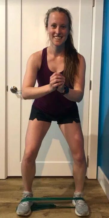 在双脚上套一根阻力带,双腿分开,脚感受到阻力带的阻力即可。然后先向左移动,几步之后再向右移动,直到双腿感觉到疲劳。