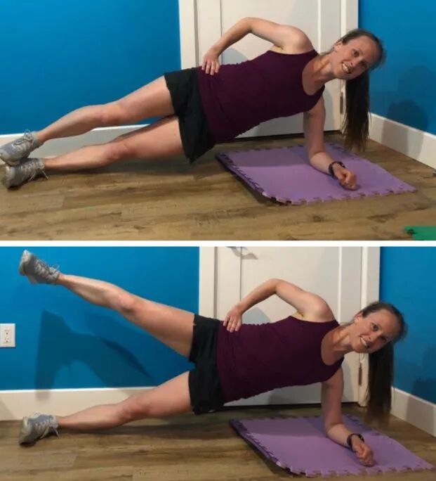 先以左侧身体躺在地面,然后用左臂支撑身体,左小臂和左肘接触到地面,臀部抬起离开地面。如果想增加难度的话,将右腿向上抬起。左侧完成3次30秒的平板撑之后,换右侧进行练习。