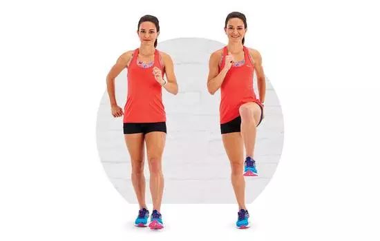 手臂保持跑步姿势(位置),核心用力挺直,做高抬腿,将右膝尽可能高的向上抬。放下还原重复(只做右腿)。