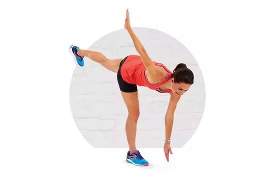 左腿立于地保持平衡,身体向前倾并向后伸直右腿(类似燕式平衡)。转动躯干,尽量使你的右手摸到左脚。