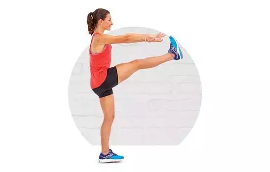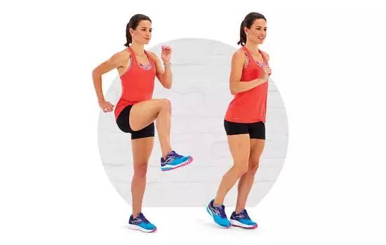 抬起右膝,使其向前伸展,尽量模仿跑步动作。放下右腿,稍弯曲,用右脚前脚掌做蹬地状。