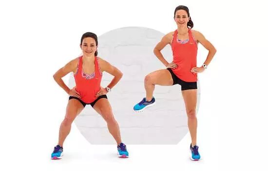 双腿深蹲,然后快速使右膝提高到体侧尽可能高的位置。将右腿还原,再做另一边。