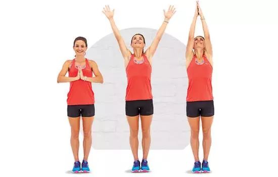 从祈祷姿势开始,双掌在胸前合十,抬肘(别夹着胳膊)。深呼吸,呼气,将双手分开经体侧上举至头上,再双掌合十。
