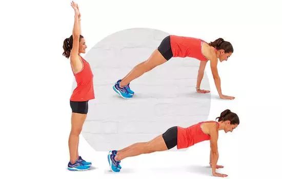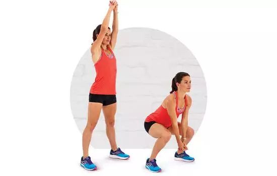 双手上举,在头上十指交握。快速下蹲,同时向下摆动手臂。立起还原,手臂摆动回头上。