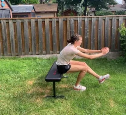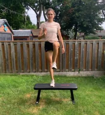 面前放一条板凳,先用右脚踩在上面,然后发力将身体提升,同时左腿向前移动,直到左大腿与地面平行。