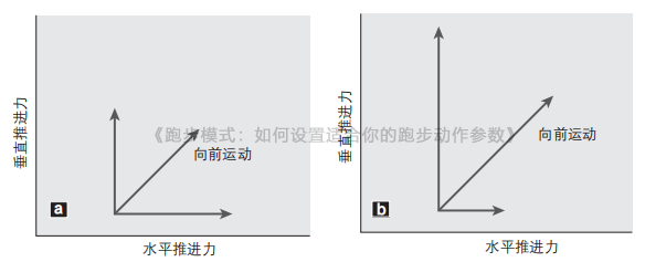 跑者在地面上的向前运动始终是垂直推进力和水平推进力共同作用的结果。垂直推进力将身体向上推,水平推进力将身体向前推。身体在地面上的向前运动可用两个力的矢量和来表示。除了高速奔跑外,身体保持直立,会导致运动矢量过于竖直向上,不会向前太远。