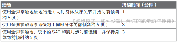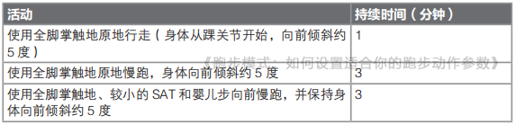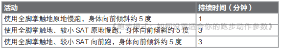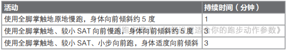 练习目标:确定完全能够赤足以全脚掌触地、较小SAT和每分钟180步的步频这3个要素完成动作,同时保持身体向前倾斜5度。