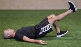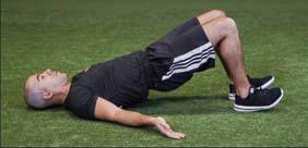 以仰卧姿势开始,两个脚跟蹬住地面,脚尖朝上(背屈),把髋抬起来,使膝、髋、肩呈一条直线(如下图)。收缩臀肌和腘绳肌来完成和保持这个姿势,而不是靠伸展腰椎。髋部下塌会大大降低练习效果。在最高点时要最用力呼气并收紧腹肌。在这个最高点的位置保持5秒的呼气时间。