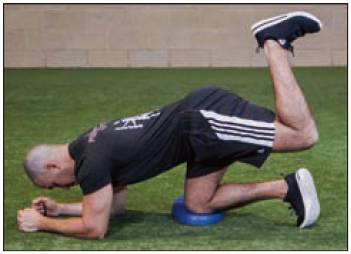 现在,在四点支撑伸髋中加入手臂和腿部的交替动作(如下图)。这是一个高级练习,初学者往往会做不好。记住,这些练习如果完成得不正确就有可能造成伤害。