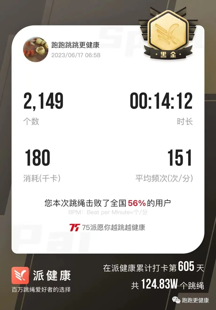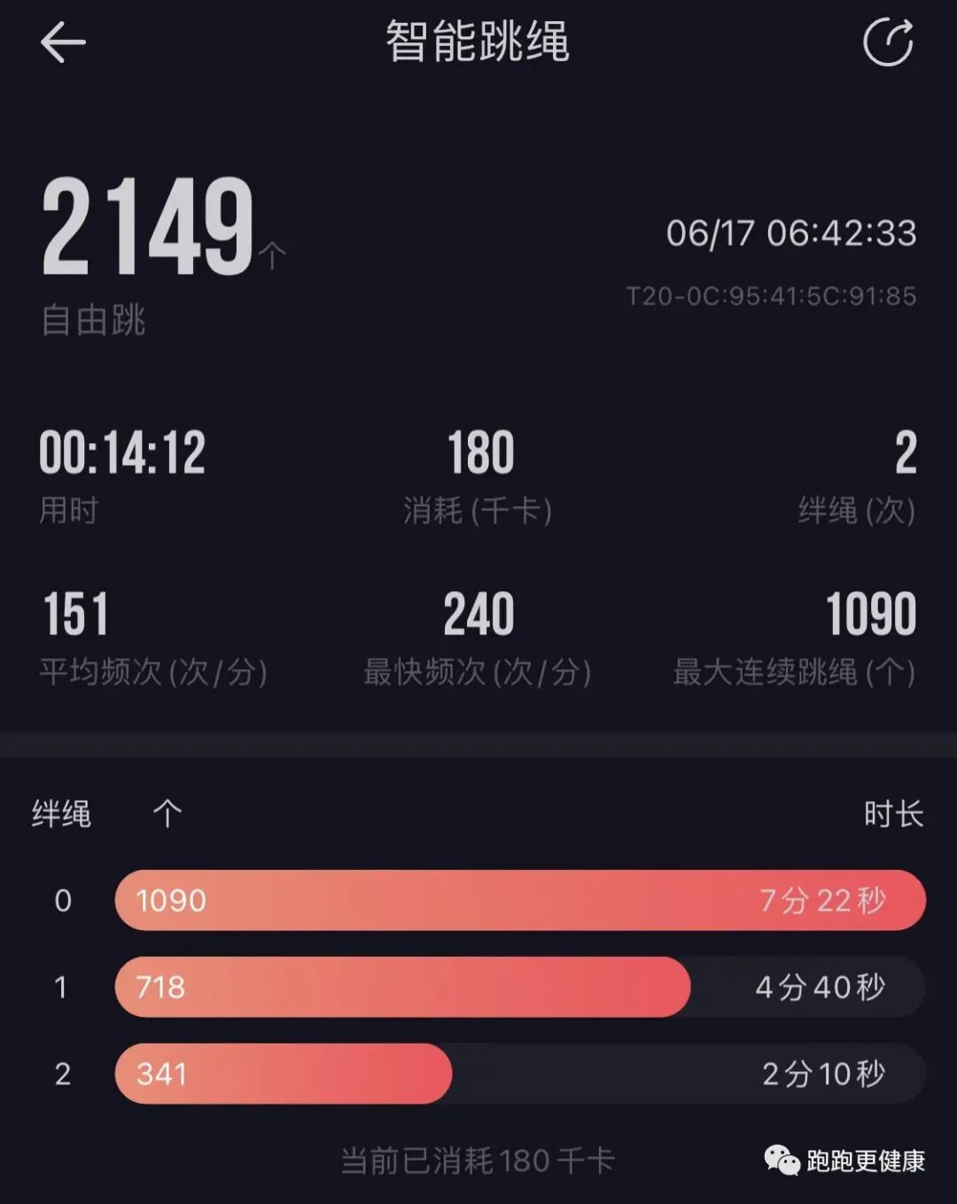 现在跑步时间少了,偶尔跑几步,多数时间都是步行。而运动更多的则是跳绳,基本上是每天都在跳,一般每天都是1000个起。