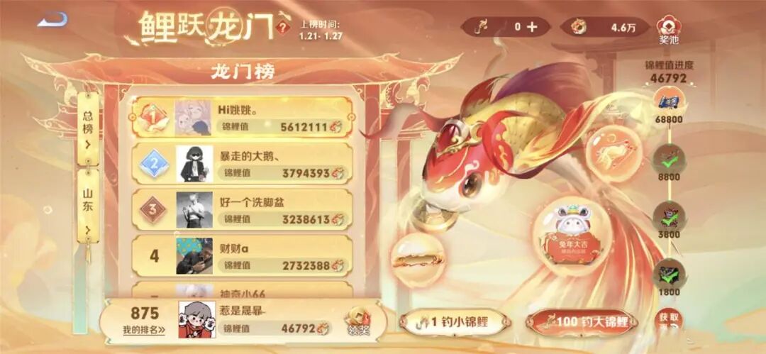 众所周知,王者荣耀兔年新春除了皮肤和福利之外,还有一个锦鲤冲榜的活动。要知道,这个锦鲤榜能够获得的奖励还是非常丰厚的,不仅有主页装扮和个性名片,还有KPL比赛门票等等哦。所以,能够拿到锦鲤TOP1的玩家,可见实力还是非常雄厚的。而在经过七天的争夺之后,王者荣耀锦鲤榜TOP1诞生了,就是这位刷了561万票的玩家。要知道,1票是等于1点券的,所以这位玩家甩开第二名100多万简直是没有压力啊。那么问题来了,你们的锦鲤值是多少呢,有没有获得专属的个性装扮呢?