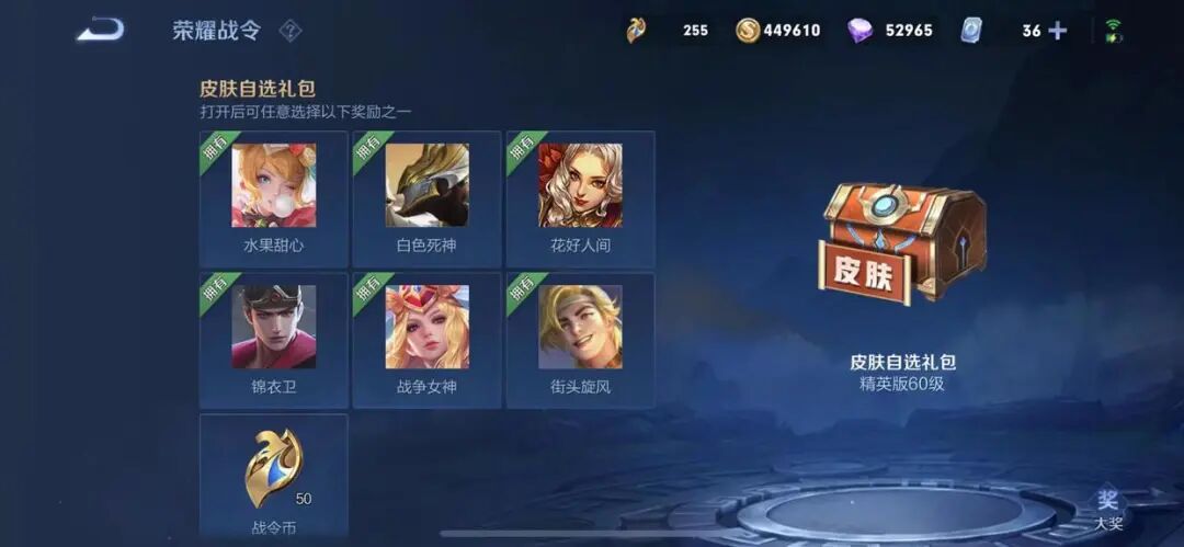 王者荣耀自从兔年新春以来,赠送给玩家的永久皮肤还是挺多的。无论是史诗品质还是勇者,甚至通过摇心愿都有玩家获得了传说皮肤,可谓是非常良心了。而在日常任务当中,玩家们通过战令系统,每个赛季也是能够保底获得一款皮肤的哦。比如说这个赛季当中,玩家60级之后领取的永久皮肤宝箱中,就有永久皮肤6选1哦。在小编看来,这六款皮肤当中,要是想换的话,还是推荐孙尚香的糖果甜心或者是白起的白色死神,毕竟这两款皮肤都是属于史诗品质的哦,兑换了不亏哈。至于氪金玩家,则是可以直接选择50个战令币哈。