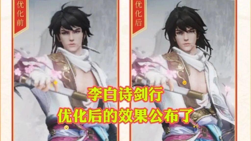 没错,作为世冠传说皮肤,李白诗剑行当初上架的时候,就遭到玩家的疯抢。毕竟,该皮肤的局内特效和模型都没得说,简直是比肩荣耀典藏了。同时,水墨风格是深得玩家心的,所以该皮肤的销量也是很高。但是呢,李白这款诗剑行也是有不足的地方,经过玩家反馈之后,王者荣耀也是终于将诗剑行进行了优化。是的,这次李白诗剑行优化,主要是针对他的发型和头发贴合程度,同时面部肤色和脸部进行了微调哦,看上去显得更加精神有木有?至于正式服更新,应该是在23号当天,诗剑行一起优化上架哦,你们期待吗?