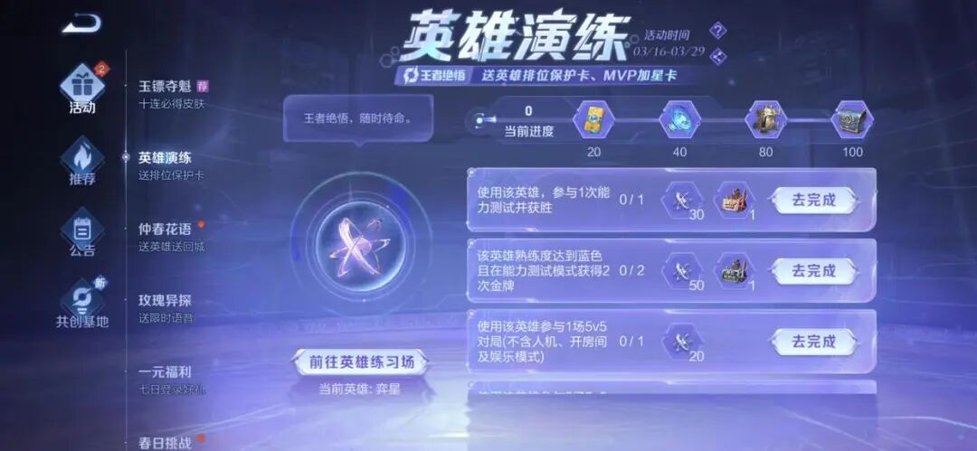 没错,王者荣耀新赛季更新的时间,一般是在抢先服之后的。而我们根据荣耀战令的结束时间是在4月2日,所以新赛季一般都是在四月份上旬左右。但是呢,王者荣耀最近上架了一个活动,那就是英雄演练。明眼人都能看出来,这个活动其实就是梦境试炼的翻版。至于结束的时间才是关键,29日该活动下架,那么30号就是抢先服的更新时间了。那么问题来了,S31抢先服提前开启,是不是也意味着正式服新赛季也会提前呢?毕竟,之前推算的新赛季时间是在4月6日,按这样来算的话,刚好是一周的时间。