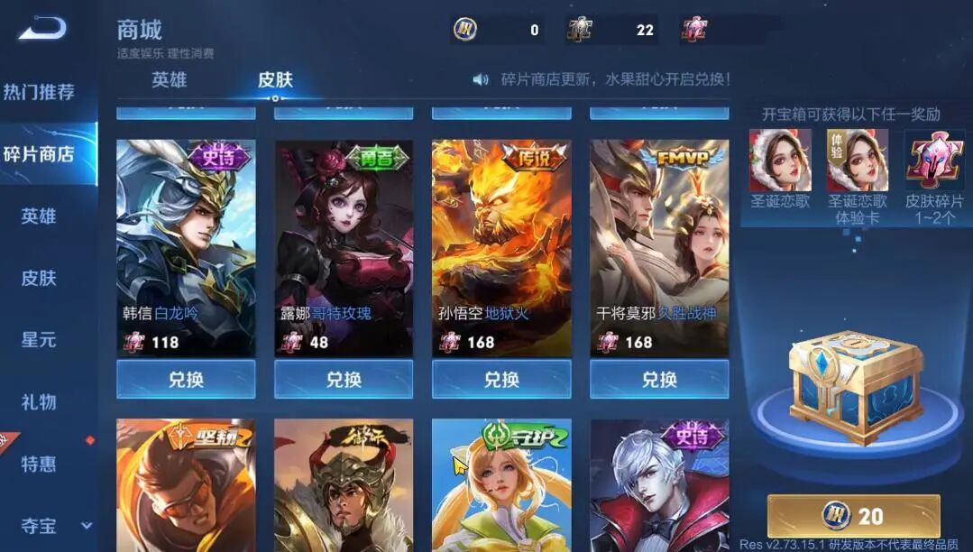 众所周知,王者荣耀本周的版本更新中,除了五五朋友节的相关活动之外,还有就是碎片商城的皮肤轮换了。没错,27号商城突变,将会有新皮肤加入的同时,一众老史诗皮肤也将会进行轮换哦。而项羽的2888皮肤苍穹之光将会被阿轲的暗夜猫娘所代替哦,同时王者荣耀体验服的史诗皮肤,也是质量非常高。想必玩家们都看到过,体验服的碎片商店不是史诗就是传说,要是能够在正式服上架,那该有多好啊,哈哈。另外,王者荣耀正式服的碎片商城巨变,或许会在本周加入莱西奥的西部警长勇者皮肤哦。只不过,该皮肤还没有爆料特效,所以只能等官方的公告了。
