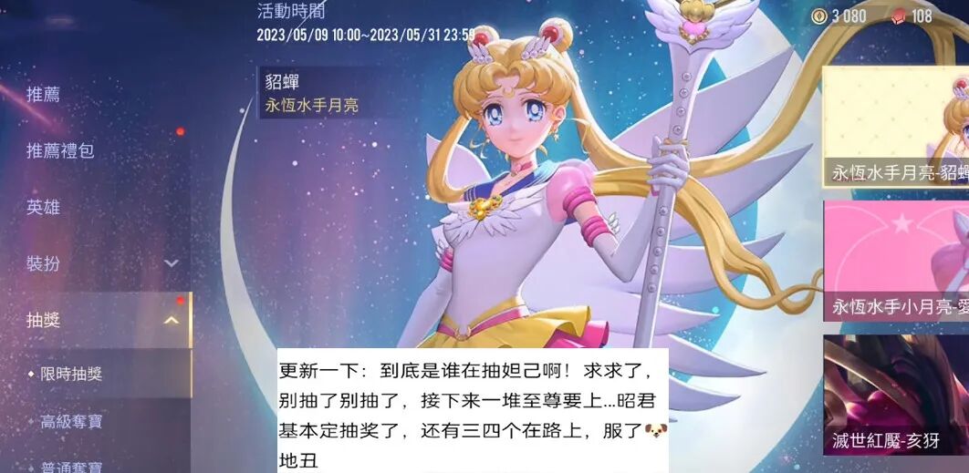 其实,王者荣耀从最初的武则天明辉仪至尊皮肤,到如今的妲己九尾狐至尊皮肤,我们可以知道,天游在后续还是会有新至尊皮肤上架的。而在妲己九尾狐皮肤事件过去没多久,就有内部人员放出消息,王者荣耀下一款新至尊皮肤已经确定,那就是王昭君的美少女战士联动皮肤。而之所以这么肯定,依据主要是因为国际服的美少女战士皮肤,也是只能通过抽奖获取。那么问题来了,王者荣耀联动的这款王昭君美少女战士,你们会去抽吗?