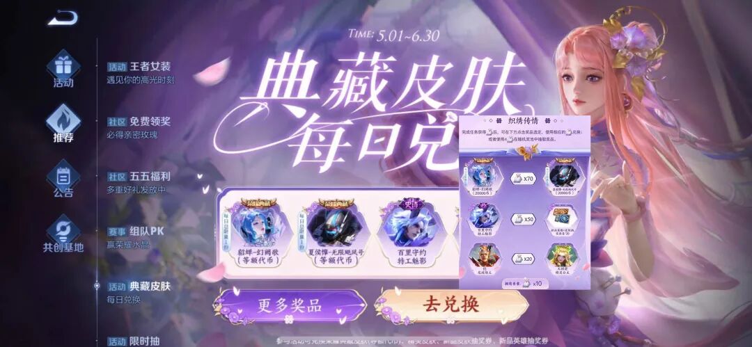 最后,我们来说说王者荣耀典藏皮肤,虽然已经确定下一款是韩信的四形态典藏皮肤,但还是有的玩家认为,瑶妹也会同步上架一款新典藏。而在最近,王者荣耀也是上架了一个活动,那就是典藏皮肤兑换。没错,玩家们只需要收集70个道具,就能够兑换貂蝉幻阙歌或者是夏侯惇的无畏飓风号典藏哦。只不过,在两个月的时间内通过每日任务收集70个基本不可能,只能通过入手实体道具才可以获得典藏皮肤哦。在小编看来,虽然典藏皮肤是能够免费换的,但是最终需要付出的代价依旧是同等的哈。各位玩家们,你们对此有什么想说的话,记得在留言区跟我交流沟通哈。