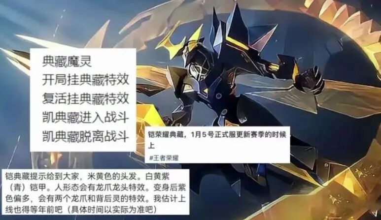 最后,我们来说说最近一直都在讨论的话题,那就是下一款荣耀典藏皮肤归属会是谁呢?有的说是孔雀典藏,也有的说是瑶妹典藏,而在这其中呼声最高的,应该就是铠皇的魔灵典藏了吧?据博主透露,铠皇新典藏皮肤拥有两种不同形态,即使是开局或者复活,都拥有新的特效哦。当然了,铠皇典藏皮肤要是能够上线的话,有1颗水晶的玩家巨赚啊。但是呢,这是未经官方证实的消息哦,还是看看好了,哈哈。各位玩家们,你们额对此有什么想说的话,记得在留言区跟我交流沟通哈。