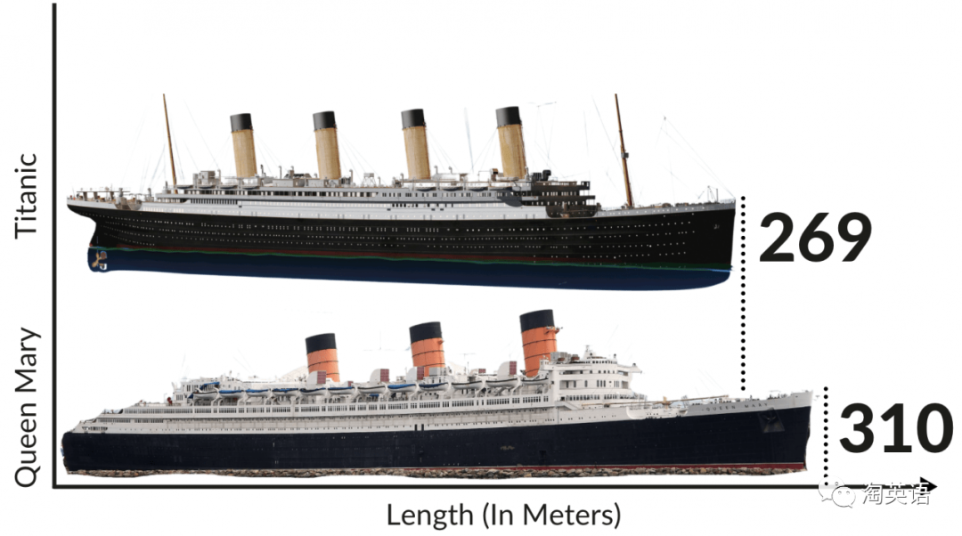 即使是玛丽女王号(1930年沉没),目前永久停靠在加利福尼亚州长滩,看起来与泰坦尼克号非常相似(减去烟囱),也比泰坦尼克号长约250英尺或74米,约15%。它们长得很像。