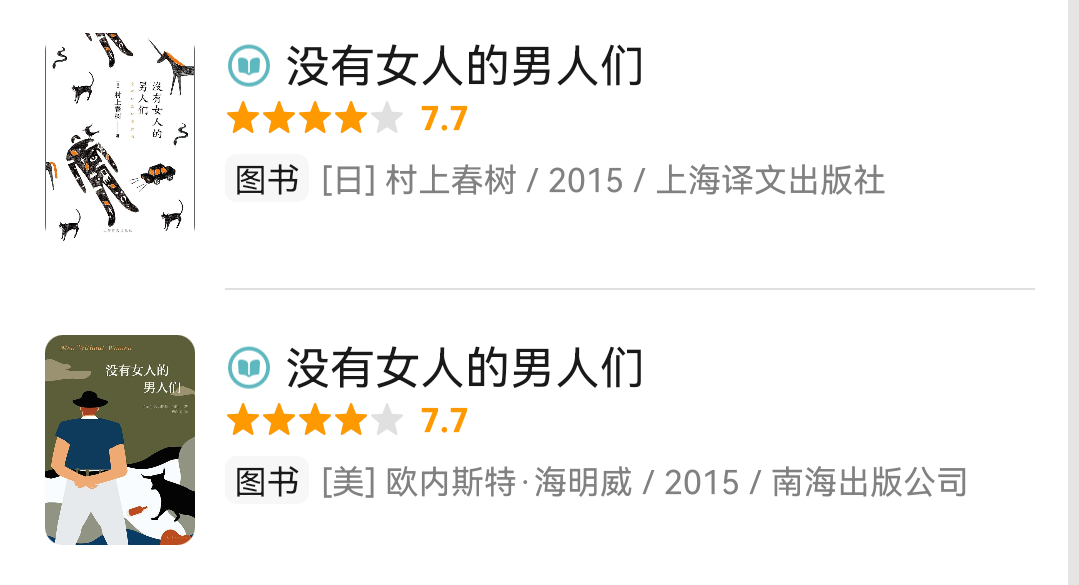 在我下载这本书封面时,我还发现,就连《没有女人的男人们》这个名字,也是和海明威的短篇小说集名字一模一样,甚至,连评分都一样。