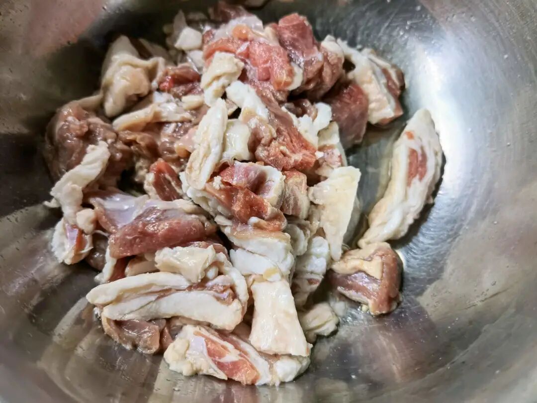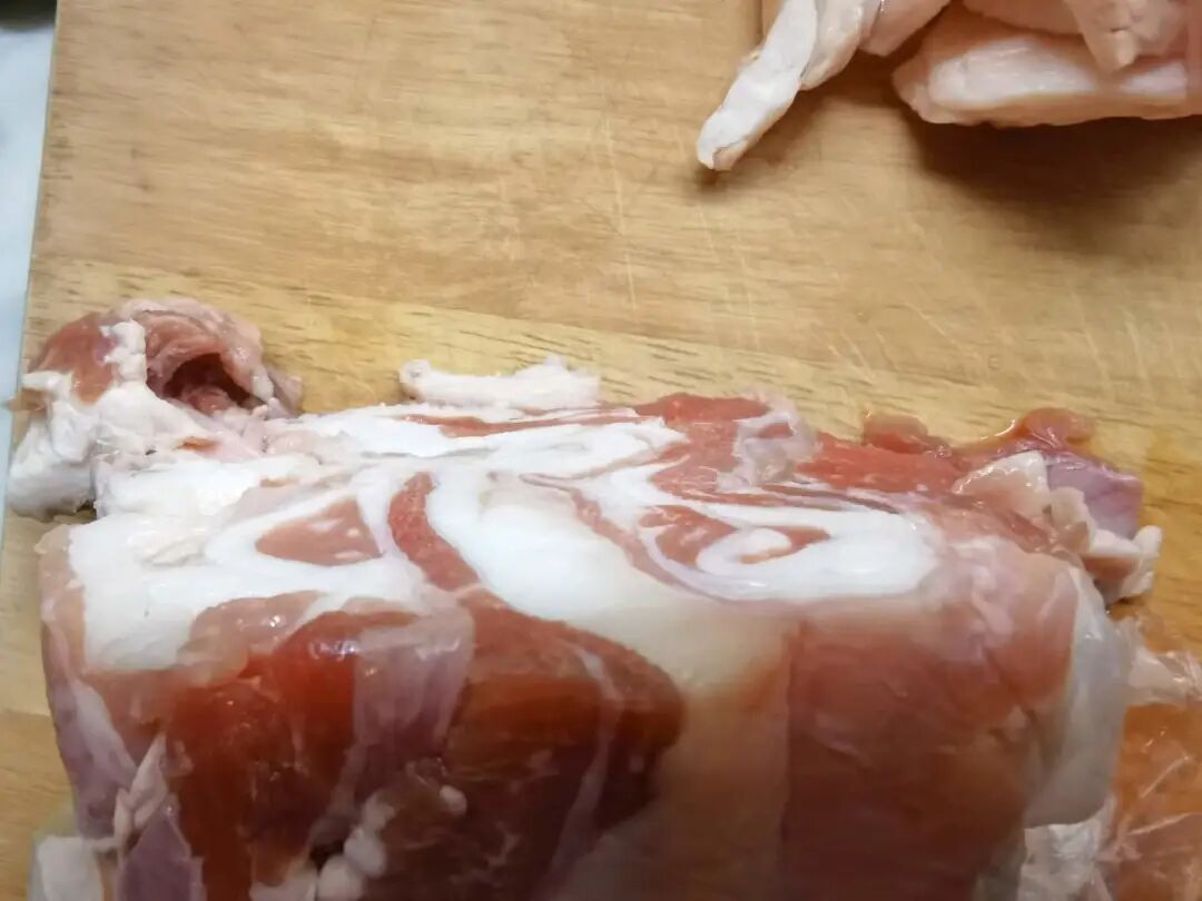 今天这一块肉,肥肉有点多,不过不要紧,先切成尽量薄的肥瘦相间的肉片,是不是肉片也不要紧,因为烤出来都差不多。