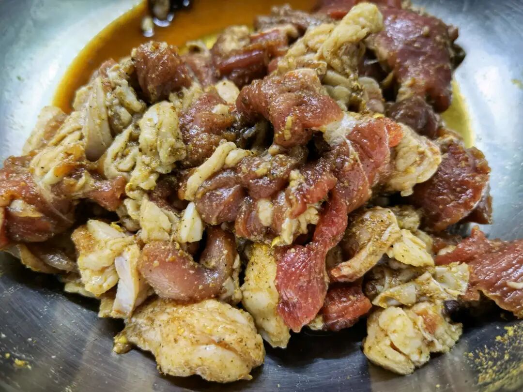 然后依次加入生抽、黑胡椒粉、花椒粉、孜然、少量的盐、一丁点料酒,用手充分地搅拌均匀,腌20分钟。
