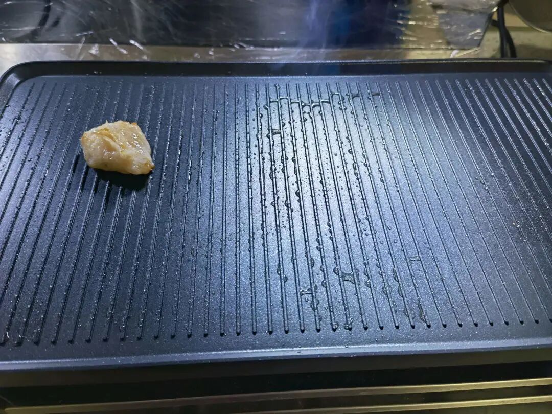 然后我用了一块肥肉,在烤盘上把油化开,为的是防止烤肉时把肉烤老。
