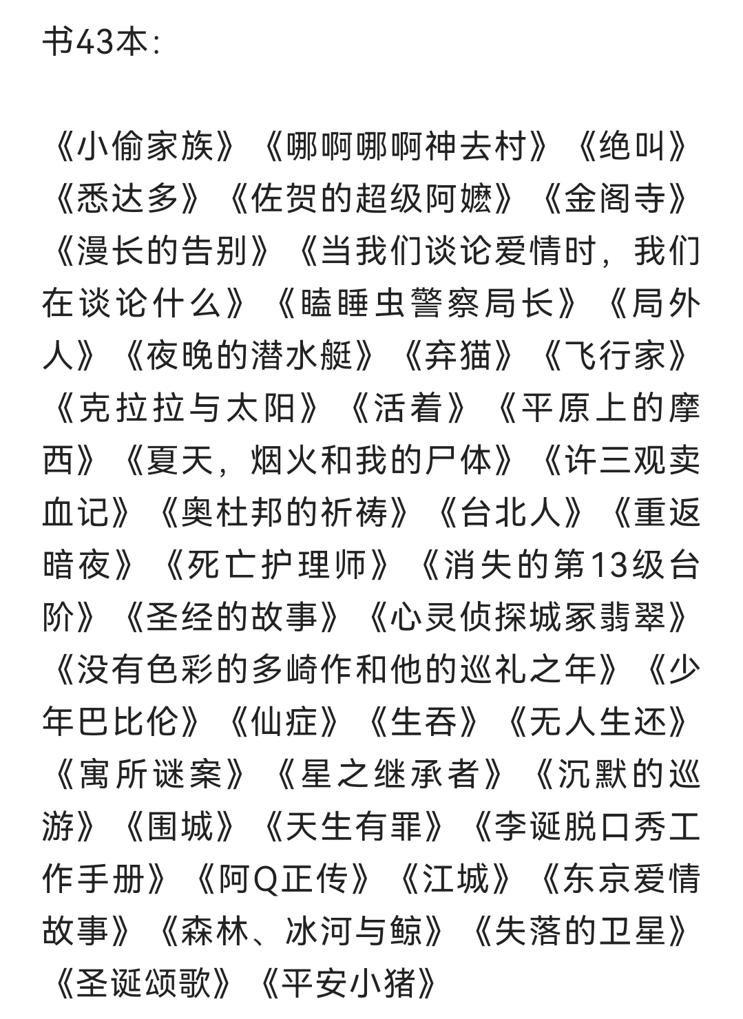 上图就是我去年看的所有书,可以看出来,大多数是小说,但也有一些非虚构类的作品,甚至不乏一些经典作品。