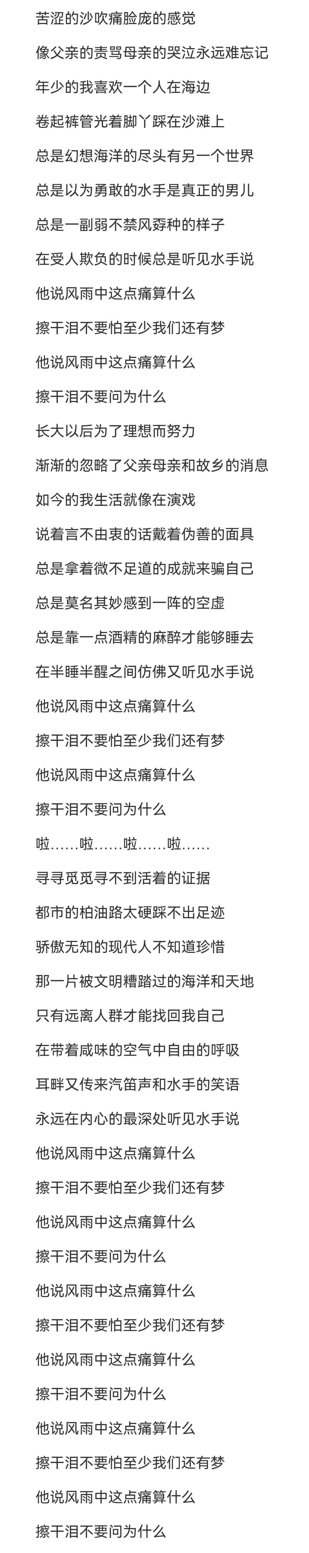 前几天,听到了《乘风破浪》改编了《水手》,突然想听这首歌了,于是就去听了。无意中发现,这首歌的歌词写的是真露骨啊。后来才知道,原来《乘风破浪》把人家的词给改了,改得完全不露骨,也不深刻了。所以今天不干别的,就来看看这首歌的歌词吧。