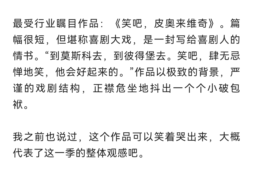 记得去年的《一年一度喜剧大赛》里,我最喜欢的作品,应该是《笑吧!皮奥莱维奇》,看了颁奖典礼的我可以说是嚎啕大哭,要问为什么,我也不知道。当时的感触是《喜剧怎么这么好哭》。