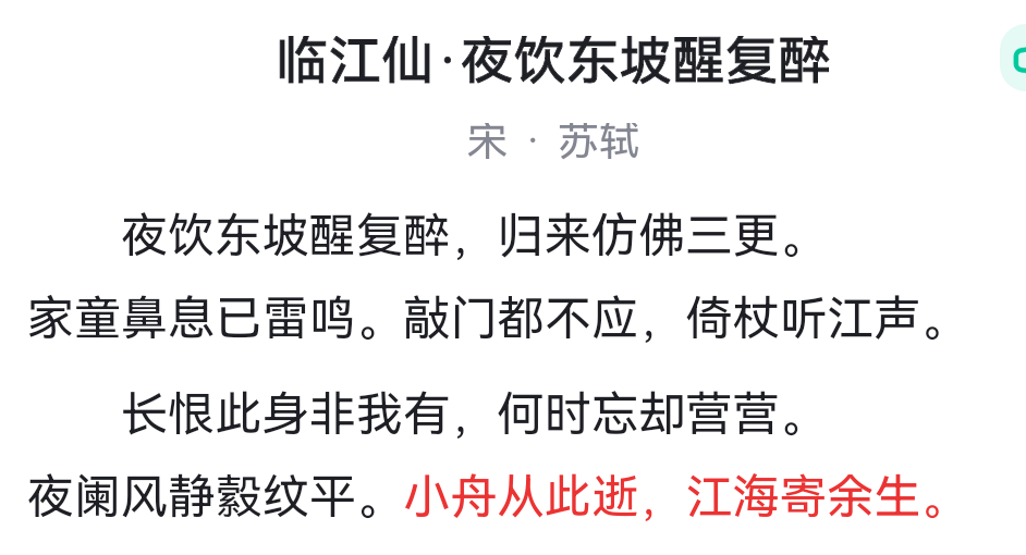 苏轼,在某一天喝多了,在东边的山坡上睡着了,突然醒来,发现酒还没喝完,于是又喝了下去,又喝多了,等到打算回家时,已经很晚了。谁知回家以后,家里人都睡了,就连家童都睡着了,打呼噜的声音就像打雷一样。苏轼一看,应该是叫不醒了。于是只好来到江边,用自己的手杖撑着,独自静静地听着江水流动的声音。听着听着,突然感觉很伤感。感觉自己的命运无法被自己掌控,悔恨自己为什么为了功名利禄而让自己变成今天这个样子。看着夜晚的河流,因为风的平息,连波纹都消失了。真想架起一个小船,让自己剩余的生命,都在这江河上度过。