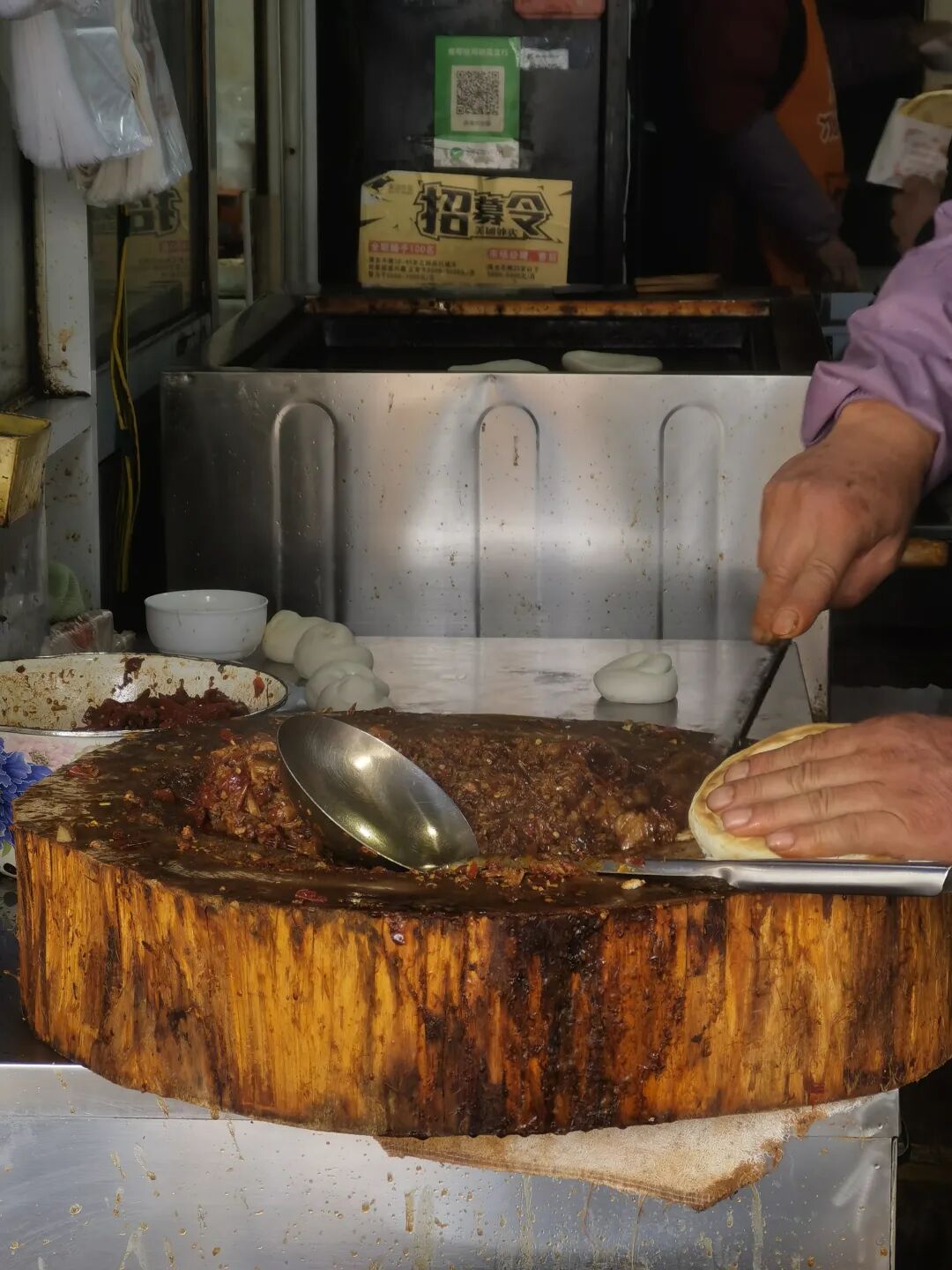 这个创举就在图左侧的那个大碗里,辣椒,这家店会在熬制腊汁肉时,专门熬制一大锅辣椒,在夹馍炖肉时,和肉在一起剁碎,就是上图中案板上的那些肉的状态,然后夹到刚烤好的白吉饼中,肉味非常醇正,辣椒非常香,绝配!