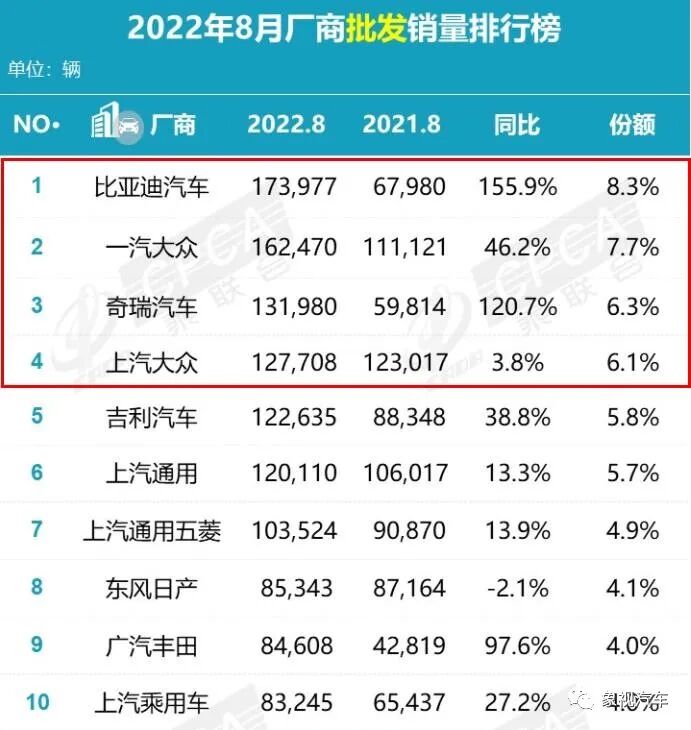 乘联会厂商8月份批发销量排行榜显示,比亚迪暴涨155.9%,以173977辆的成绩,位居榜首,从南北大众手中夺得了销冠宝座。一汽大众虽然同比劲增46.2%,销量达到162470辆,但还是输给了比亚迪,只能排在第二名。