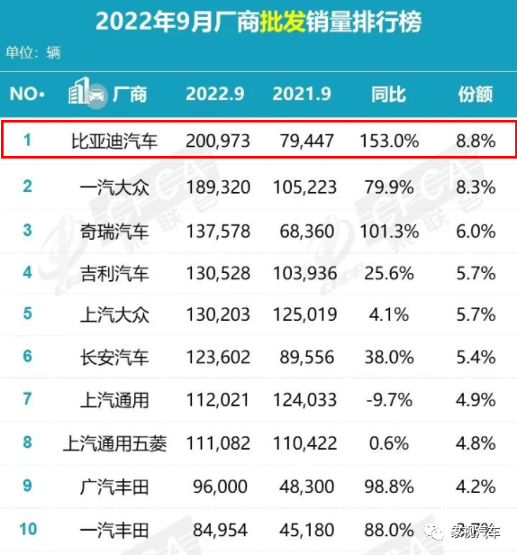乘联会销量排行榜显示,比亚迪力压南北大众,高居榜首。无论传统车企还是新能源车企,在销量上都被甩在身后,比亚迪成为中国最大的车企。