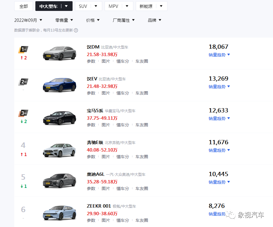 数据显示,9月中大型轿车销量排行榜上,比亚迪汉DM销量高达18067辆,高居第一位;汉EV则以13269辆的成绩,排名第二。