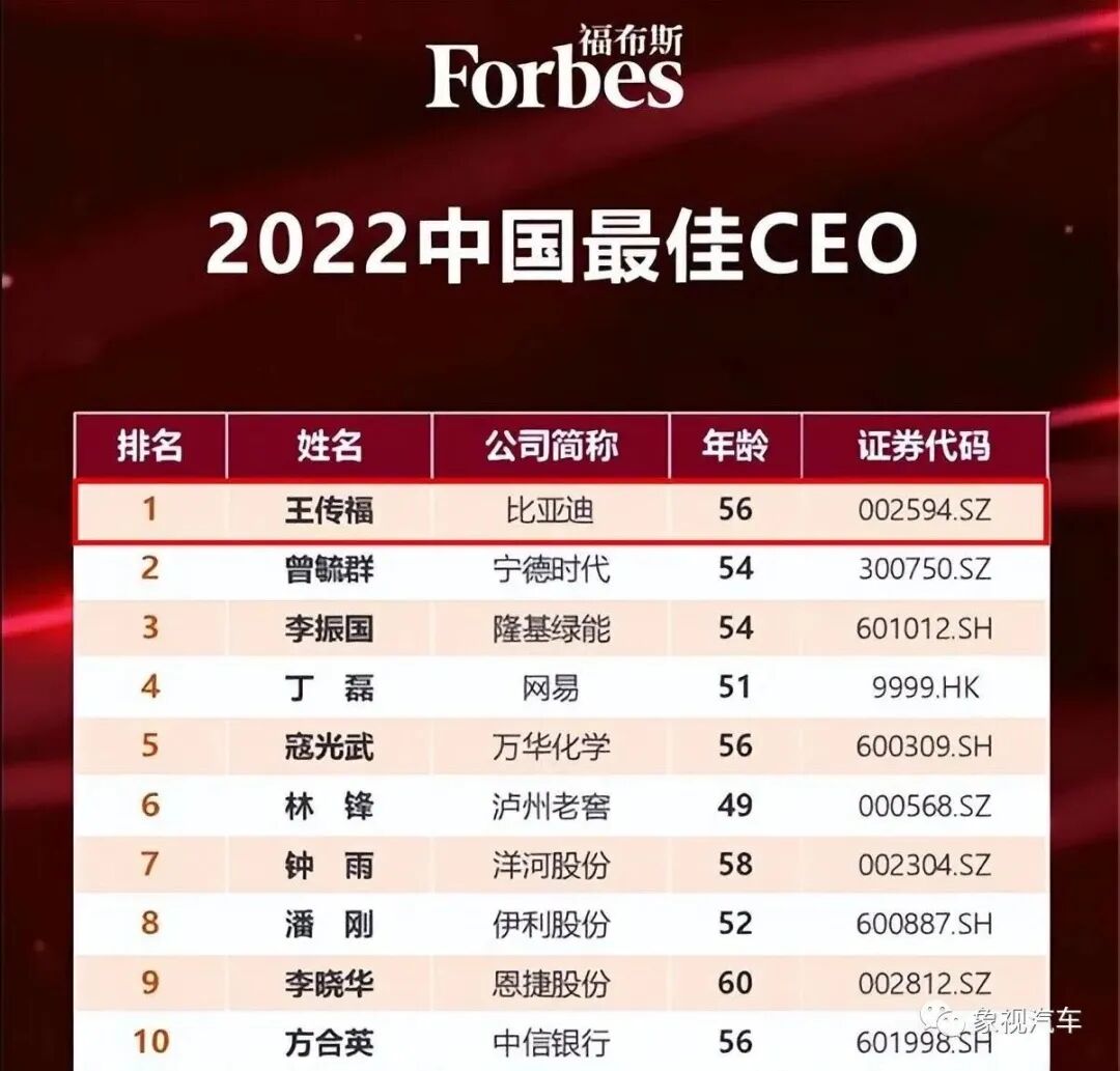 早前,福布斯2022中国最佳CEO榜单上,比亚迪创始人王传福力压宁德时代曾毓群、网易丁磊等,高居榜首。美国《财富》杂志2022年世界500强企业中,比亚迪也成功入榜。