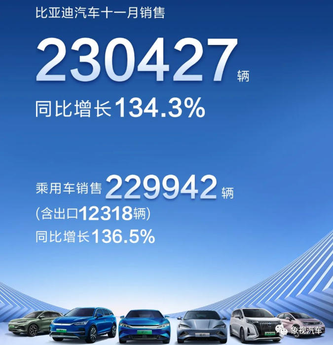在刚刚过去的11月份,比亚迪销量达到了历史性的230427辆,同比暴涨134.3%,连续三个月突破20万辆。
