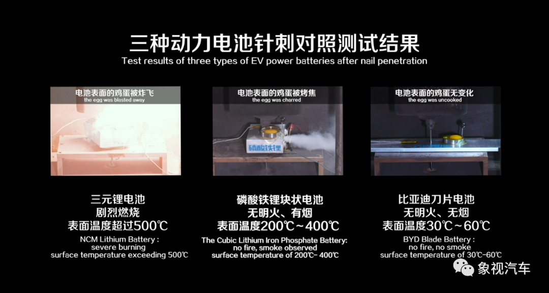 刀片电池的优异表现,让特斯拉等竞争对手,也开始纷纷切换搭载磷酸铁锂电池。甚至有媒体报道称,特斯拉也将从比亚迪采购刀片电池。同为磷酸铁锂,刀片电池到底有何特殊之处?首先,刀片电池树立了动力电池安全新标杆。针刺测试是电池300多项安全测试中公认最为严苛的一项,刀片电池针刺后,无明火也无烟,表面温度仅为30-60℃;普通磷酸铁锂电池针刺后,会冒烟,表面温度20-400℃;而三元锂电池针刺后,会剧烈燃烧,表面温度超过500℃。