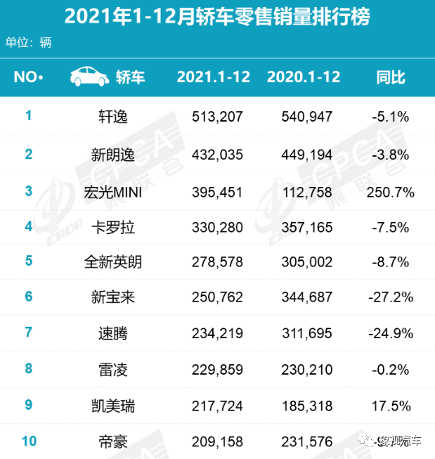 翻开乘联会2021年轿车销量十强榜,合资品牌占据八个席位,日产轩逸和大众朗逸,牢牢占据着冠军和亚军。