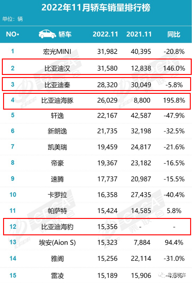 当然,比亚迪并未止步于此,在乘联会11月轿车销量排行榜上,比亚迪车型占据了四个席位。
