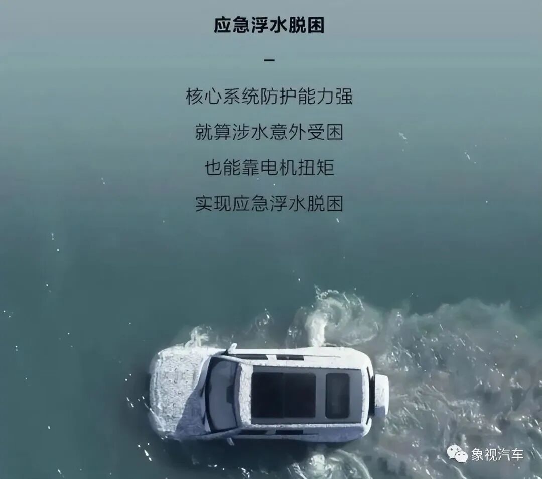 此外,四轮独立矢量控制功能,叠加IP68 的核心系统防水等级,搭载“易四方”技术的车型,具备业界少有的应急浮水功能。换而言之,这样的车辆堪称陆水两栖两用的。