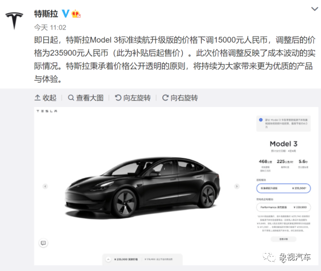 事实上,特斯拉的降价,早已不再是新闻,似乎成了它的常规操作。在此仅以国产特斯拉Model 3为例,有媒体整理显示,自2019年10月开启预售以来,到如今不足两年的时间内,先后经历了6次调价,从一开始的35.58万元降至如今的23.59万元,累计降幅近12万。其中2019年1次,2020年3次,今年2次。间隔时间最短为1个月,最大降幅为3.2万元。特斯拉降价频率之快、幅度之大,都远超其他车企。