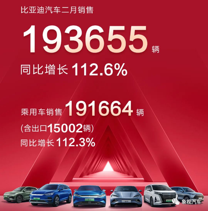 而在刚刚过去的2月份,比亚迪销量达到19.37万辆,同比暴涨112.6%,再度逼近20万辆大关。乘联会预计同期全国新能源零售销量40万辆,同比增至46.6%。