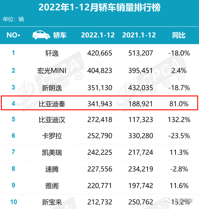 2021年比亚迪秦售出约20万辆,基本赶上了速腾、雷凌等。2022年秦继续乘风破浪,卖出约35万辆,仅次于轩逸和朗逸。