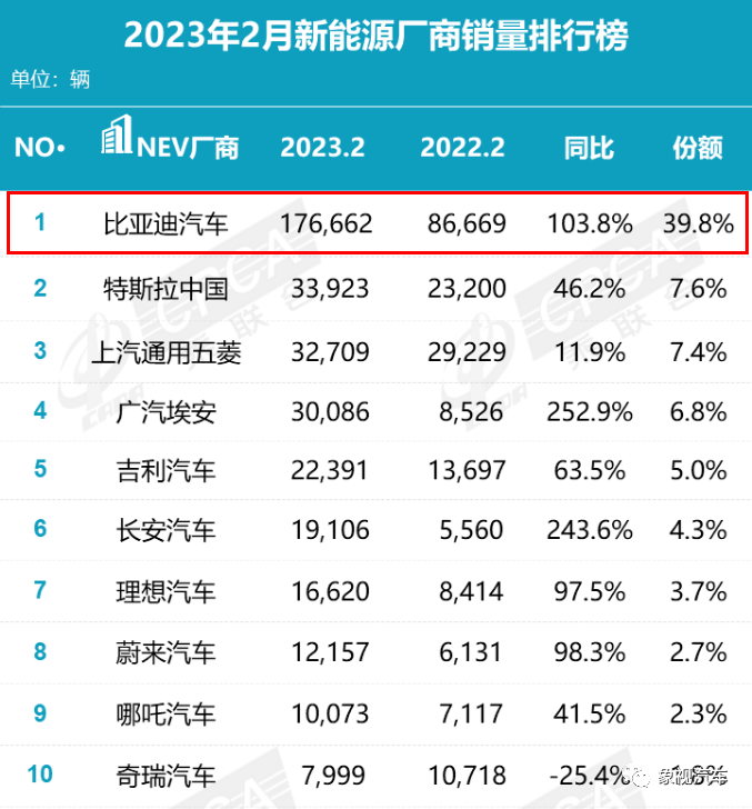 最后,2月份新能源车企销量排行榜上,比亚迪同比暴涨103.8%,以接近18万台的销量,再一次稳居销冠宝座,将其他车企远远甩在身后。