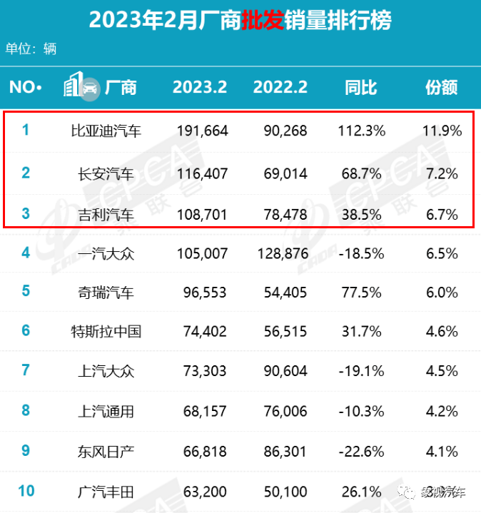 乘联会2月车企批发销量排行榜显示,比亚迪、长安、吉利三家车企,破天荒地包揽了前三甲。此外,奇瑞也高居第四名。