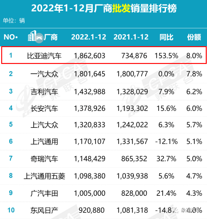 正是在这一年,比亚迪首次问鼎中国车市销冠。这是自主品牌第一次力压南北大众和通用,坐上销冠宝座。