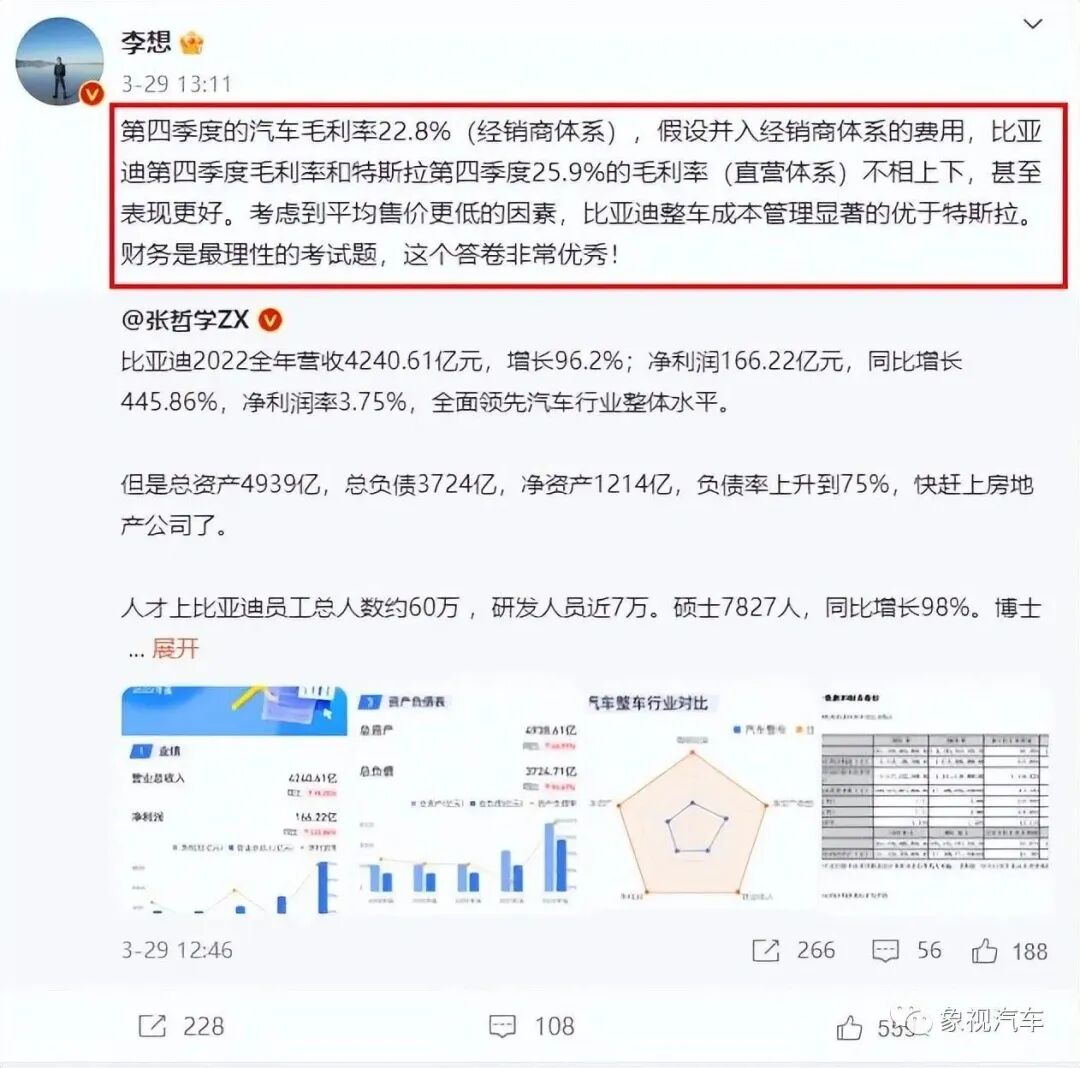 他指出,比亚迪去年第四季度毛利率为22.8%,假设并入经销商体系的费用,那么比亚迪毛利率和特斯拉同期25.9%不相上下,甚至表现更好。