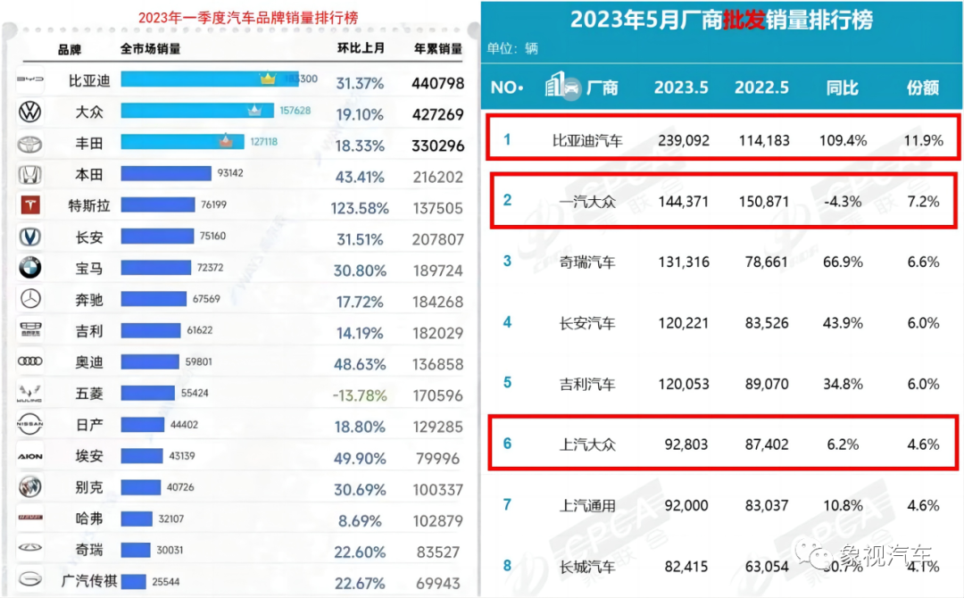 乘联会数据显示,今年5月份比亚迪售出23.9万辆,比南北大众合计的23.7万辆还要多。